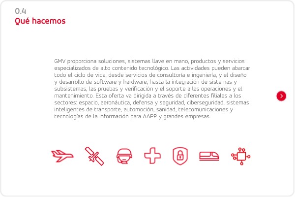 GMV proporciona soluciones, sistemas llave en mano, productos y servicios especializados de alto contenido tecnológico. Las actividades pueden abarcar todo el ciclo de vida, desde servicios de consultoría e ingeniería, y el diseño y desarrollo de software y hardware, hasta la integración de sistemas y subsistemas, las pruebas y verificación y el soporte a las operaciones y el mantenimiento. Esta oferta va dirigida a través de diferentes filiales a los sectores: espacio, aeronáutica, defensa y seguridad, ciberseguridad, sistemas inteligentes de transporte, automoción, sanidad, telecomunicaciones y tecnologías de la información para AAPP y grandes empresas.