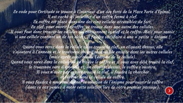 Le code pour Certitude se trouve à l’intérieur d’un des forts de la Place Forte d’Epinal. Il est caché à l’intérieur d’un coffre fermé à clef. Le coffre est placé dans une des cinq cellules accessibles du fort. La clef, pour ouvrir le coffre, se trouve dans une autre des cellules. Il vous faut donc trouver les cellules qui contiennent la clef et le coffre. Mais pour savoir si une cellule contient un de ces objets, il faudra satisfaire à une « petite » énigme ! Quand vous serez dans la cellule où se trouve la clef, en cliquant dessus, elle s’ajoutera à l’anneau et le trousseau obtenu sera visible ensuite dans les autres cellules (mais après avoir résolu l’énigme de la cellule). Quand vous serez dans la cellule où se trouve le coffre et si vous avez déjà trouvé la clef, le trousseau sera disponible et, en cliquant dessus, le coffre s’ouvrira. Si vous n’avez pas encore trouvé la clef, il faudra la chercher et revenir dans la cellule du coffre. Il vous faudra à nouveau donner la solution de l’énigme pour ouvrir le coffre (dans ce cas pensez à noter cette solution lors de votre premier passage).
