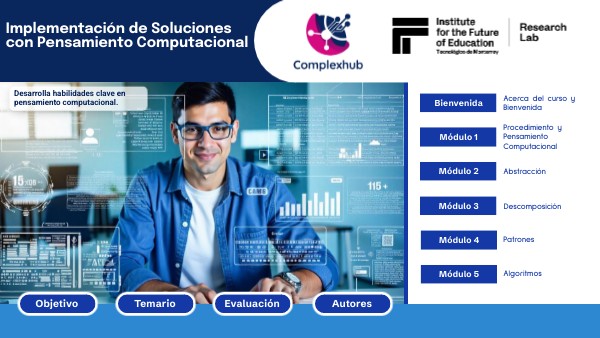 Este curso introductorio tiene como objetivo desarrollar en los participantes una comprensión integral del Pensamiento Computacional como competencia clave para resolver problemas de manera lógica, estructurada y eficiente. A través de herramientas conceptuales y metodológicas, se busca fortalecer la capacidad de análisis, diseño de soluciones y toma de decisiones fundamentadas en diversos contextos. Este curso está estructurado en cinco módulos. El primero introduce los fundamentos del pensamiento computacional, y los cuatro siguientes abordan de manera específica cada una de sus subcompetencias: abstracción, descomposición, reconocimiento de patrones y algoritmos.