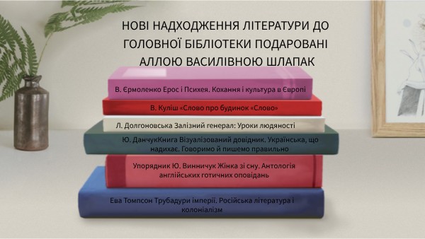 Нові надходження літератури до головної бібліотеки подаровані Аллою Василівною Шлапак