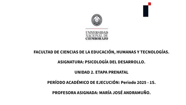 FACULTAD DE CIENCIAS DE LA EDUCACIÓN, HUMANAS Y TECNOLOGÍAS.ASIGNATURA: PSICOLOGÍA DEL DESARROLLO. UNIDAD 2. ETAPA PRENATAL PERÍODO ACADÉMICO DE EJECUCIÓN: Periodo 2025 - 1S. PROFESORA ASIGNADA: MARÍA JOSÉ ANDRAMUÑO.