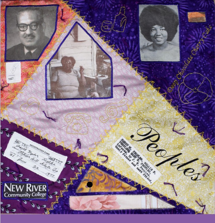 J.T. Peoples started the family farm in Pulaski, Virginia, where his legacy of the family farm continued through multiple generations. Some of the many things grown on the Peoples family farm were Green Beans and Potatoes, which are displayed in the top left of the quilt block, along with a Steel Rake similar to one the family would have used on the farm. The fabric used in this section of the quilt square details light golden and pink flowers to represent the farmland, its beauty, and all it gave to the family.