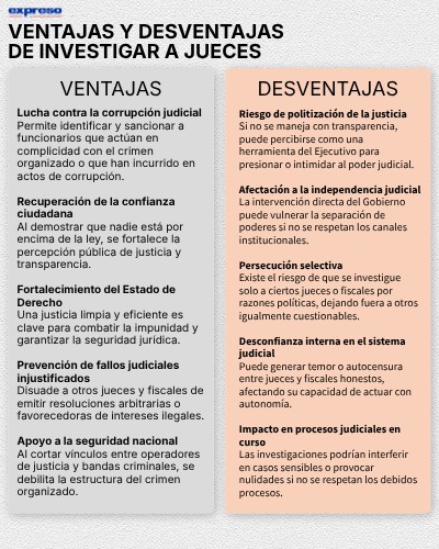 Riesgo de politización de la justiciaSi no se maneja con transparencia, puede percibirse como una herramienta del Ejecutivo para presionar o intimidar al poder judicial. Afectación a la independencia judicial La intervención directa del Gobierno puede vulnerar la separación de poderes si no se respetan los canales institucionales. Persecución selectiva Existe el riesgo de que se investigue solo a ciertos jueces o fiscales por razones políticas, dejando fuera a otros igualmente cuestionables. Desconfianza interna en el sistema judicial Puede generar temor o autocensura entre jueces y fiscales honestos, afectando su capacidad de actuar con autonomía. Impacto en procesos judiciales en curso Las investigaciones podrían interferir en casos sensibles o provocar nulidades si no se respetan los debidos procesos.