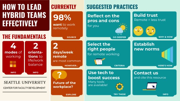 Hoption, C., & Green, D. A. (2025). How to lead effective hybrid teams [Infographic]. Seattle University Center for Faculty Development. https://www.seattleu.edu/faculty-development/faculty-resources/effective-hybrid-teams