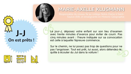 Le jour-J, déposez votre enfant sur son lieu d'examen avec trente minutes d'avance pour éviter de courir. Pas cinq minutes avant : l’heure indiquée sur sa convocation est celle à laquelle l’épreuve commence. Sur le chemin, ne lui posez pas trop de questions pour ne pas l'angoisser. Tout est prêt, lui aussi, alors détendez-le, quitte à écouter du Jul dans la voiture !