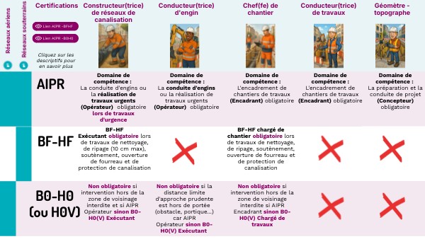 AIPR et habilitation pour les ouvrages électriques aériens : Les connaissances requises IPR faisant partie du tronc commun de base de toutes les formations, il est admis que toute habilitation électrique puisse permettre cette reconnaissance de compétence. Toutefois, l’autorisation d’intervention à proximité de réseaux n’est dans ce cas valable que pour les ouvrages électriques aériens, le travailleur n’étant pas autorisé à effectuer des travaux à proximité d’ouvrages souterrains ou subaquatiques.