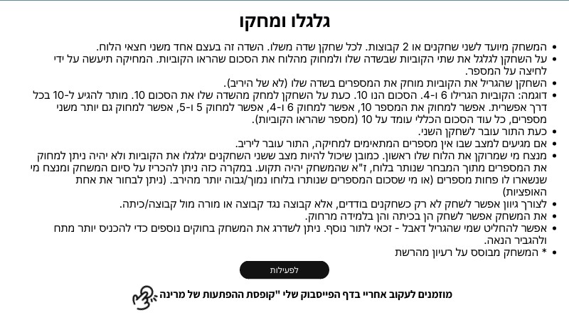 על השחקן לגלגל את שתי הקוביות שבשדה שלו ולמחוק מהלוח את הסכום שהראו הקוביות. המחיקה תיעשה על ידי לחיצה על המספר.