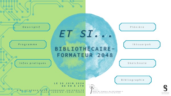 Et si on réfléchissait ensemble à ce que sera notre métier de bibliothécaire-formateur en 2048, au prisme des problématiques écologiques et numériques ? Et si on pouvait d’ores et déjà imaginer les bibliothèques du futur et notre rôle en tant que professionnels de l'enseignement supérieur ? Et si on interrogeait les transformations de la société de l'information et leur impact sur le métier de bibliothécaire-formateur dans les 30 prochaines années ? Et si on interrogeait les compétences et les outils nécessaires pour accompagner au mieux nos publics dans un environnement en constante évolution ? Et si on pouvait mettre en place dès aujourd’hui des formations pour créer un futur plus désirable ? Et si on prévoyait une journée d'échange et de réflexion collective, où chacun puisse partager son expertise et ses réflexions sur l'avenir de notre métier dans les bibliothèques du futur ?
