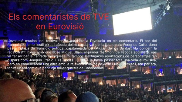 L’evolució musical del festival corre paral·lela a l’evolució en els comentaris. El cor del franquisme, amb l’estil eixut i efectiu del malaguanyat periodista català Federico Gallo, dona pas a l'etapa de transició política, capitanejada per Miguel de los Santos. No oblidem la recalcitrant ironia amb què José Miguel Ullán, el primer testimoni de l’època socialista, ens va fer arribar la cantada muniquesa, ni tampoc les fugaces aportacions de personatges tan dispars com Joaquín Prat o Luis Cobos. El 2004 ja havia passat tota una vida eurovisiva, però en començàrem una altra amb la rejovenida llavor de José Luis... Pécker i, ara per ara, tenim un tàndem que pedaleja millor que els de Cannondale.