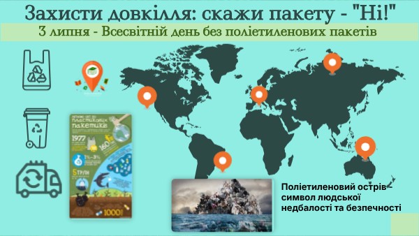 3липня - Міжнародний день відмови від поліетиленових пакетів та загальноукраїнська акція «День без поліетилену». Головною метою акції є формування екологічною поведінки та світогляду населення, привернення уваги до проблеми забруднення довкілля, як наслідок надмірного використання одноразових пакетів.На законодавчому рівні в Україні було зареєстровано законопроєкт про зменшення кількості пластикових пакетів в цивільному обігу № 9507 від 28.01.2019, який передбачає заборону реалізації поліетиленових пакетів з товщиною стінки до 50 мікрон з першого січня 2022 року. Також передбачено обов'язкову сертифікацію пакетів на придатність до біорозкладу (для біорозкладних пакетів) у відповідності до національних стандартів з першого січня 2021 року. Хоча ще далеко до повної відмови від використання, але початок покладеноНа законодавчому рівні в Україні було зареєстровано законопроєкт про зменшення кількості пластикових пакетів в цивільному обігу № 9507 від 28.01.2019, який передбачає заборону реалізації поліетиленових пакетів з товщиною стінки до 50 мікрон з першого січня 2022 року. Також передбачено обов'язкову сертифікацію пакетів на придатність до біорозкладу (для біорозкладних пакетів) у відповідності до національних стандартів з першого січня 2021 року. Хоча ще далеко до повної відмови від використання, але початок покладеноНа законодавчому рівні в Україні було зареєстровано законопроєкт про зменшення кількості пластикових пакетів в цивільному обігу № 9507 від 28.01.2019, який передбачає заборону реалізації поліетиленових пакетів з товщиною стінки до 50 мікрон з першого січня 2022 року. Також передбачено обов'язкову сертифікацію пакетів на придатність до біорозкладу (для біорозкладних пакетів) у відповідності до національних стандартів з першого січня 2021 року. Хоча ще далеко до повної відмови від використання, але початок покладеноНа законодавчому рівні в Україні було зареєстровано законопроєкт про зменшення кількості пластикових пакетів в цивільному обігу № 9507 від 28.01.2019, який передбачає заборону реалізації поліетиленових пакетів з товщиною стінки до 50 мікрон з першого січня 2022 року. Також передбачено обов'язкову сертифікацію пакетів на придатність до біорозкладу (для біорозкладних пакетів) у відповідності до національних стандартів з першого січня 2021 року. Хоча ще далеко до повної відмови від використання, але початок покладеноНа законодавчому рівні в Україні було зареєстровано законопроєкт про зменшення кількості пластикових пакетів в цивільному обігу № 9507 від 28.01.2019, який передбачає заборону реалізації поліетиленових пакетів з товщиною стінки до 50 мікрон з першого січня 2022 року. Також передбачено обов'язкову сертифікацію пакетів на придатність до біорозкладу (для біорозкладних пакетів) у відповідності до національних стандартів з першого січня 2021 року. Хоча ще далеко до повної відмови від використання, але початок покладеноНа законодавчому рівні в Україні було зареєстровано законопроєкт про зменшення кількості пластикових пакетів в цивільному обігу № 9507 від 28.01.2019, який передбачає заборону реалізації поліетиленових пакетів з товщиною стінки до 50 мікрон з першого січня 2022 року. Також передбачено обов'язкову сертифікацію пакетів на придатність до біорозкладу (для біорозкладних пакетів) у відповідності до національних 