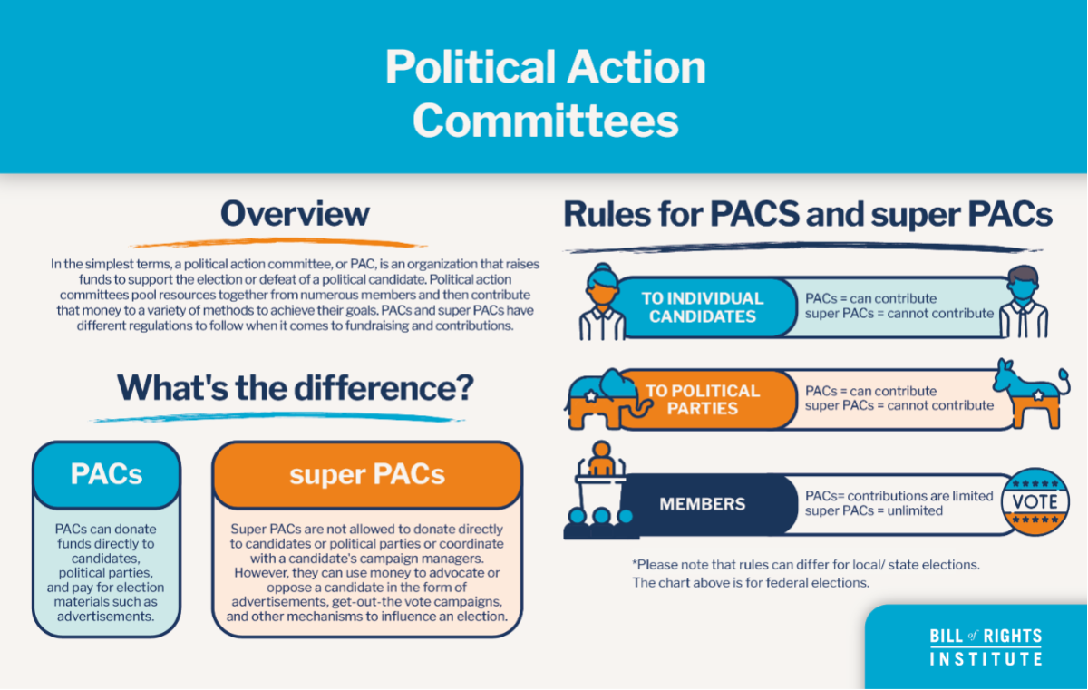 There are different kinds of PACs. For example, connected PACs, whose members have a “connection” or belong to a group like a labor union, trade organization, or corporation. Nonconnected PACs are made up of people from the general public. Leadership PACs are established by a government official to support other members of their party. There are also Hybrid PACs, which follow some rules of PACs and some SuperPACs. PACs can donate funds directly to candidates, political parties, and pay for election materials such as advertisements.