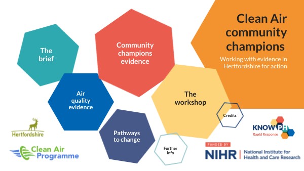 This work was funded by the National Institute for Health and Care Research (NIHR) Public Health Research Programme. Award number NIHR159057. The views expressed are those of the authors and not necessarily those of the NIHR or the Department of Health and Social Care.Many thanks go to Hertfordshire County Council for hosting the event and for the support of the Clean Air Programme. All participants are gratefully acknowledged. Suggested citation: Such, E. Clark, M. Marshall, F. and Tattersall, A. (2025) Clean Air community champions. Working with the evidence in Hertfordshire for action. Available at https://view.genially.com/68595c40c8dfe8efb4e1ef4b. KNOW-PH.