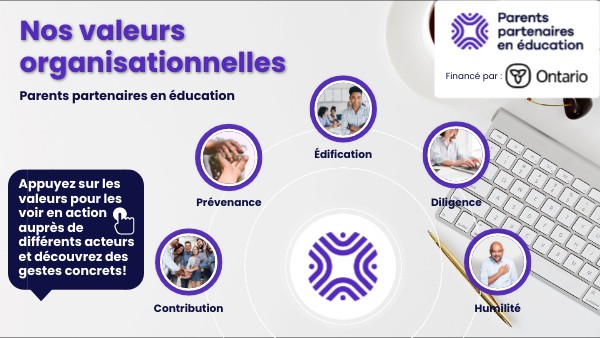 Appuyez sur les valeurs pour les voir en action auprès de différents acteurs et découvrez des gestes concrets!