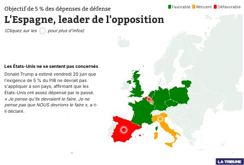 Pedro Sánchez a plusieurs fois fait part de son refus de porter les dépenses de défense à 5 % du PIB, qualifiant cette possibilité de « déraisonnable et contre-productif ». Selon le chef du gouvernement espagnol, les 2,1 % du PIB que le pays consacre actuellement suffisent pour « acquérir et maintenir tout le personnel, tout l'équipement, toutes les infrastructures » nécessaires pour « faire face » aux « menaces » et aux « défis », a-t-il assuré dimanche soir.