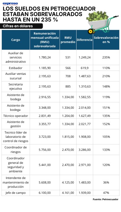 Los sueldos en Petroecuador estaban sobrevalorados hasta en un 235 %