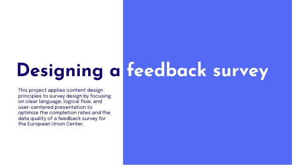 This project applies content design principles to survey design by focusing on clear language, logical flow, and user-centered presentation to optimize the completion rates and the data quality of a feedback survey for the European Union Center.