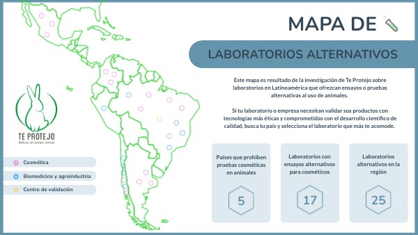 Este mapa es resultado de la investigación de Te Protejo sobre laboratorios en Latinoamérica que ofrezcan ensayos o pruebas alternativas al uso de animales. Si tu laboratorio o empresa necesitan validar sus productos con tecnologías más éticas y comprometidas con el desarrollo científico de calidad, busca tu país y selecciona el laboratorio que más te acomode.
