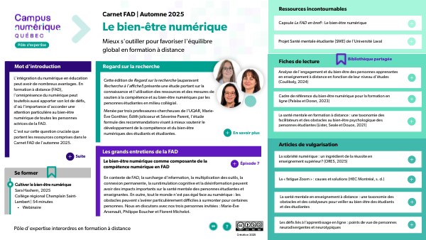 Pour citer ce document : Pôle d’expertise interordres en formation à distance. (2025, automne). Carnet FAD – Le bien-être numérique. Campus numérique Québec. Sous licence CC BY-NC-SA. https://view.genially.com/685d7b781263bcc51b1d07a6
