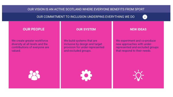 - Going forward, we will deliver our equality outcomes through the “New ideas” strand. Our aim is to tackle pressing inequalities in sport. We will test new ideas for excluded groups and be prepared to fail and learn. Our work will evolve as we learn..