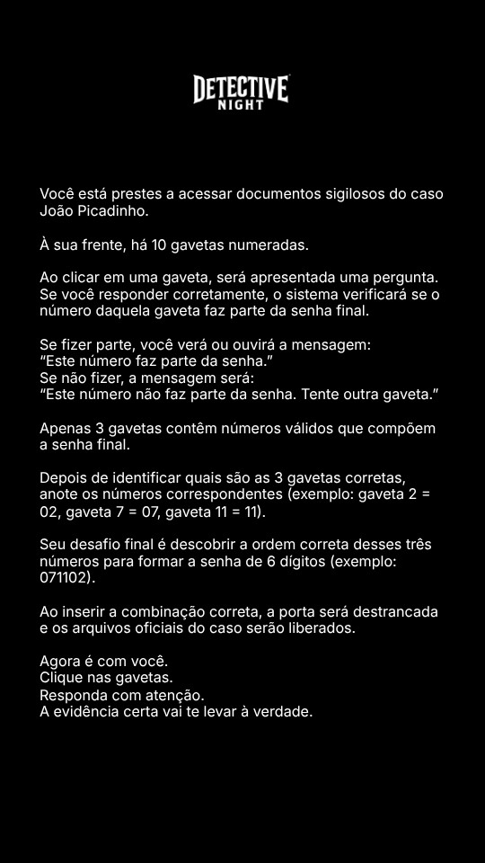 Você está prestes a acessar documentos sigilosos do caso João Picadinho. À sua frente, há 10 gavetas numeradas. Ao clicar em uma gaveta, será apresentada uma pergunta. Se você responder corretamente, o sistema verificará se o número daquela gaveta faz parte da senha final. Se fizer parte, você verá ou ouvirá a mensagem: “Este número faz parte da senha.” Se não fizer, a mensagem será: “Este número não faz parte da senha. Tente outra gaveta.” Apenas 3 gavetas contêm números válidos que compõem a senha final. Depois de identificar quais são as 3 gavetas corretas, anote os números correspondentes (exemplo: gaveta 2 = 02, gaveta 7 = 07, gaveta 11 = 11). Seu desafio final é descobrir a ordem correta desses três números para formar a senha de 6 dígitos (exemplo: 071102). Ao inserir a combinação correta, a porta será destrancada e os arquivos oficiais do caso serão liberados. Agora é com você. Clique nas gavetas. Responda com atenção. A evidência certa vai te levar à verdade.