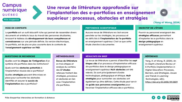 Pour citer ce document : Pôle d’expertise interordres en formation à distance (2025). Une revue de littérature approfondie sur l’implantation des e-portfolios en enseignement supérieur : processus, obstacles et stratégies. [Fiche de lecture de An In-Depth Literature Review of E-Portfolio Implementation in Higher Education : Processes, Barriers, and Strategies, par Yang, H. et Wong, R., 2024]. Campus numérique Québec. Sous licence CC BY-NC-SA. https://view.genially.com/685eca330d87e3d4c387d327