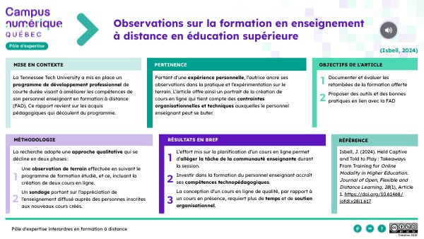 Pour citer ce document : Pôle d'expertise interordres en formation à distance (2025). Observations sur la formation en enseignement à distance en éducation supérieure [Fiche de lecture de Held Captive and Told to Play : Takeaways From Training for Online Modality in Higher Education, par Isbell, J., 2024]. Campus numérique Québec. Sous licence CC BY-NC-SA https://view.genially.com/685ede6a715430ac3681aeaf