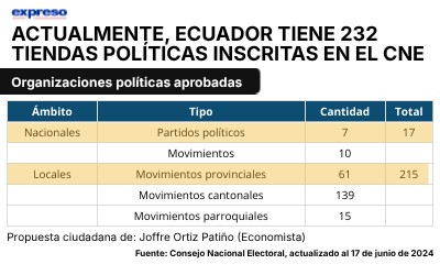 Actualmente, Ecuador tiene 232 tiendas políticas inscritas en el CNE