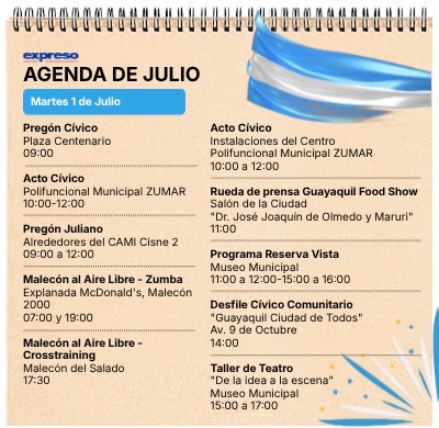 Pregón Cívico Plaza Centenario 09:00 Acto Cívico Polifuncional Municipal ZUMAR 10:00-12:00 Pregón Juliano Alrededores del CAMI Cisne 2 09:00 a 12:00 Malecón al Aire Libre - Zumba Explanada McDonald's, Malecón 2000 07:00 y 19:00 Malecón al Aire Libre - Crosstraining Malecón del Salado 17:30