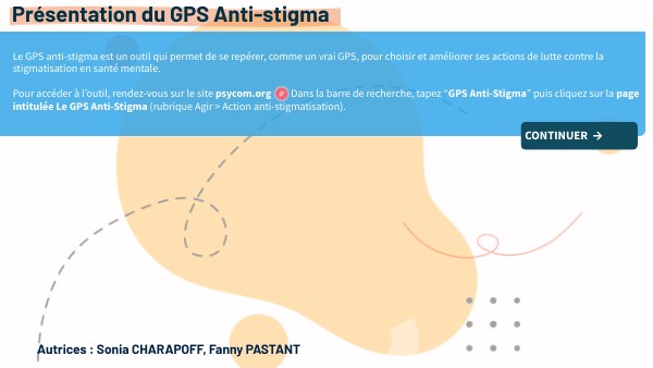 Le GPS anti-stigma est un outil qui permet de se repérer, comme un vrai GPS, pour choisir et améliorer ses actions de lutte contre la stigmatisation en santé mentale. Pour accéder à l’outil, rendez-vous sur le site psycom.org Dans la barre de recherche, tapez “GPS Anti-Stigma” puis cliquez sur la page intitulée Le GPS Anti-Stigma (rubrique Agir > Action anti-stigmatisation).