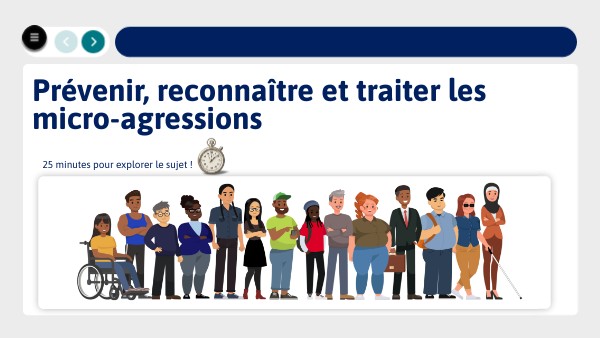 Découvrez le module « Micro-agressions au travail » : Un parcours interactif qui vous apprend à repérer les propos et comportements subtils, comprendre leurs impacts (stress, perte de confiance, climat toxique) et agir efficacement, que vous soyez témoin, manager, ou victime. À travers des mises en situation réalistes, des quiz, des vidéos, vous renforcerez votre posture inclusive et contribuerez à prévenir les micro-agressions au sein de notre entreprise.