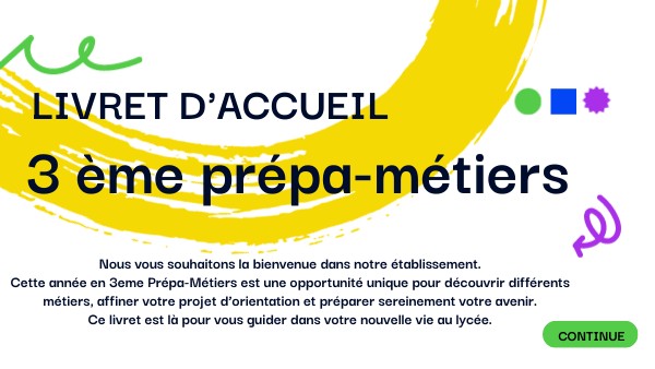 Nous vous souhaitons la bienvenue dans notre établissement.Cette année en 3eme Prépa-Métiers est une opportunité unique pour découvrir différents métiers, affiner votre projet d’orientation et préparer sereinement votre avenir.Ce livret est là pour vous guider dans votre nouvelle vie au lycée.