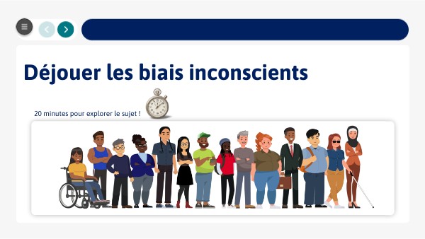 Découvrez le module « Déjouer les biais inconscients » : Un parcours interactif qui vous apprend à comprendre ces mécanismes automatiques qui influencent nos décisions et interactions professionnelles, souvent à notre insu. S'ils facilitent le traitement de l'information, les biais inconscients peuvent aussi conduire à des jugements erronés et perpétuer des stéréotypes. À travers des mises en situation réalistes, des quiz, des vidéos, vous renforcerez votre posture inclusive et contribuerez à prévenir les biais inconscients au sein de votre entreprise.