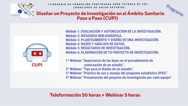 Módulo 1: EVALUACIÓN Y AUTORIZACIÓN DE LA INVESTIGACIÓN. Módulo 2: BÚSQUEDA BIBLIOGRÁFICA. Módulo 3: PLANTEAMIENTO Y DISEÑO DE UNA INVESTIGACIÓN. Módulo 4: BASES Y ANÁLISIS DE DATOS. Módulo 5: RESULTADOS DE INVESTIGACIÓN. Módulo 6: ELABORACIÓN DE TU PROYECTO DE INVESTIGACIÓN. 1ª Webinar “Importancia de las leyes en el procedimiento de autorización de un estudio”. 2ª Webinar “Tips para el diseño de un estudio”. 3ª Webinar “Práctica de uso y manejo del programa estadístico SPSS”. 4ª Webinar “Presentación del proyecto de investigación por cada equipo”.