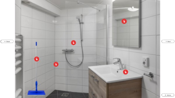 Materiaal: Rapido frame + Rapido scrub mop, groene handpoly met VAT vloer ECO. Handeling: Vloer in badkamer en toilet in zijn geheel klam-vochtig reinigen. Scrubmop daarna in waszak deponeren.