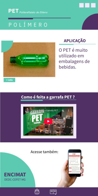 O politereftalato de etileno (PET ou PETE) é aplicado em embalagens devido a sua leveza, transparência, resistência mecânica e química, além do baixo custo. O PET, após o uso, pode ser transformado em tecidos através do processo de reciclagem. Por exemplo, cinco garrafas de refrigerante geram fibra de poliéster suficiente para uma camiseta GG.