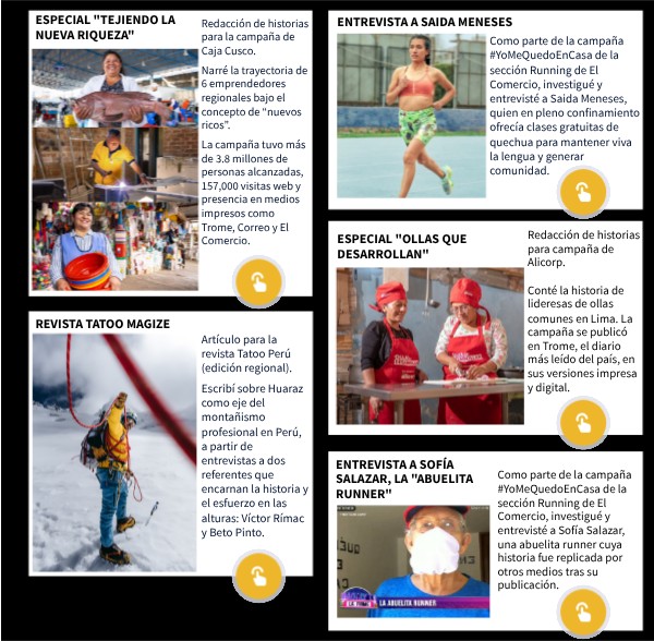Redacción de historias para la campaña de Caja Cusco. Narré la trayectoria de 6 emprendedores regionales bajo el concepto de “nuevos ricos”. La campaña tuvo más de 3.8 millones de personas alcanzadas, 157,000 visitas web y presencia en medios impresos como Trome, Correo y El Comercio.