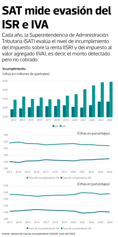 Cada año, la Superintendencia de Administración Tributaria (SAT) evalúa el nivel de incumplimiento del impuesto sobre la renta (ISR) y del impuesto al valor agregado (IVA), es decir, el monto detectado pero no cobrado.