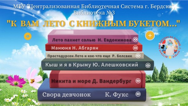 К вам лето с книжным букетом! : виртуальная выставка книг о лете : 6+ / [сост. М. Л. Балобина ; оформ. М. Л. Балобина] ; МБУ «Централизованная Библиотечная Система г. Бердска», библиотека №3. – Бердск, 2024. - Текст. Изображение : электронные // Genial.ly. : [облачный сервис]. – URL: https://view.genially.com/65d450b7afe0580014782484/presentation-gagarin-pervyj-navsegda (дата обращения: 10.07.2025). - Режим доступа : Сайт МБУ «ЦБС» г. Бердска, Раздел «О библиотеке. Структура библиотек ЦБС. Библиотека №3», подраздел «Виртуальные выставки»
