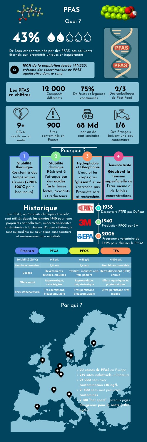 Les PFAS, ou "produits chimiques éternels", sont utilisés depuis les années 1940 pour leurs propriétés antiadhésives, imperméabilisantes et résistantes à la chaleur. D'abord célébrés, ils sont aujourd'hui au cœur d’une crise sanitaire et environnementale mondiale.
