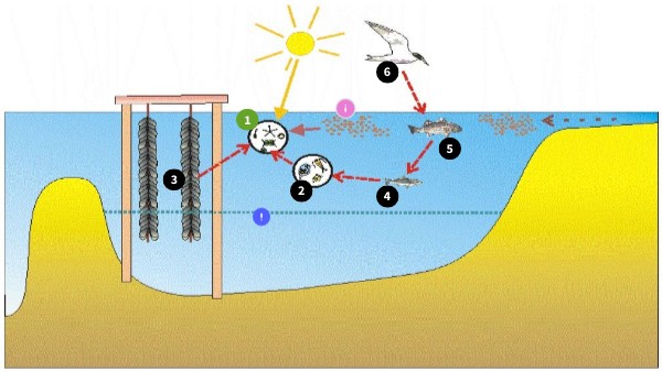 Els musclos són uns mol·luscs bivalves que s'alimenten filtrant l'aigua per alimentar-se del fitoplàncton (consumidors primaris). Aquí al delta creixen a ritme trepidant, gràcies a les aportacions d'aigua dolça provinents del riu Ebre i dels canals de regadiu. Tota aquesta aigua rica en nutrients afavoreix la gran quanitat de fitoplàncton a l'aigua de les badies i, en conseqüència, permet el cultiu del musclo a nivell industrial.