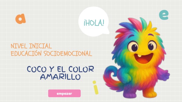 Hoy llegó a la sala un nuevo amigo: se llama Coco. Es un monstruito muy especial, suave, redondo y lleno de colores ¿Saben qué es lo más curioso? Coco cambia de color según cómo se siente. Cuando está feliz, se vuelve amarillo; si está triste, se pone azul; cuando se enoja, se tiñe de rojo, y si tiene miedo, se vuelve negro. Cada día Coco vendrá a visitarnos con una emoción distinta y una aventura para compartir.