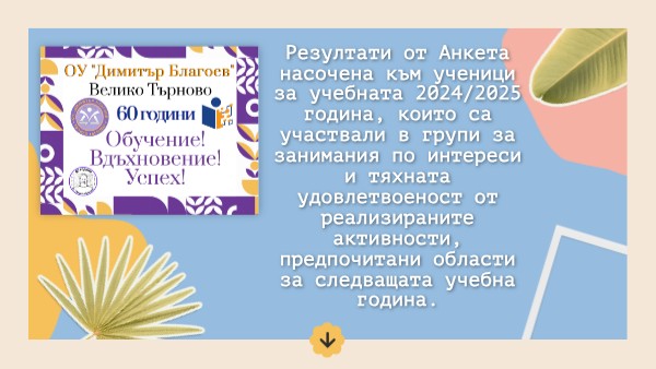 Резултати от Анкета насочена към ученици за учебната 2024/2025 година, които са участвали в групи за занимания по интереси и тяхната удовлетвоеност от реализираните активности, предпочитани области за следващата учебна година.