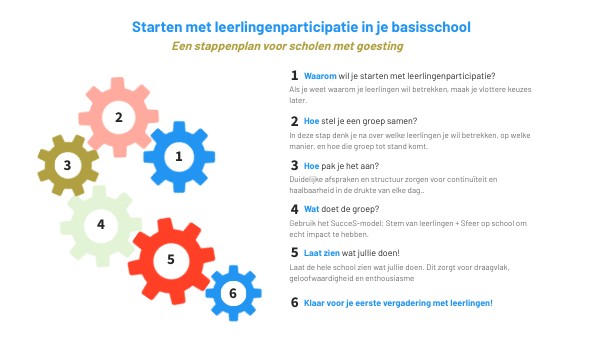 Een sterke leerlingenraad of werkgroep zorgt voor Stem én Sfeer. Leerlingen vertellen wat er leeft in de klas en op school, maar denken ook mee na over oplossingen. Tegelijk bedenken ze leuke acties die de school gezelliger maken. Belangrijk is dat iedereen ziet wat de leerlingenraad doet, en dat er een goed evenwicht is tussen meedenken en sfeer maken. Zo wordt het een écht SucceS-volle groep!