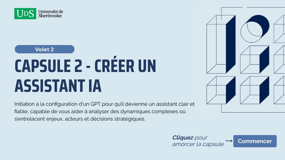 Voici les 5 sections qui composent la capsule 2 Elles vous guideront pas à pas, de la compréhension des limites des agents conversationnels fondés sur de grands modèles de langage (GML) jusqu’à la conception d’un assistant IA réellement adapté à des environnements complexes.