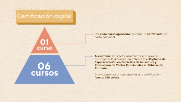 Al culminar satisfactoriamente todo el plan de estudios de la diplomatura obtendrás el Diploma de Especialización en Didáctica de la Lectura y Producción de Textos Funcionales en Educación Primaria