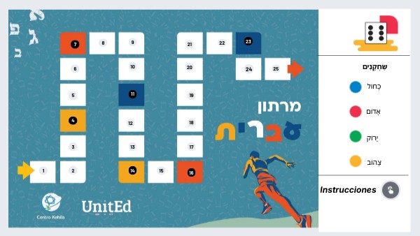 Instrucciones del juego El juego puede ser jugado por 2 a 4 participantes. Cada jugador debe elegir una ficha (amarilla, azul, roja o verde) y lanzar el dado. El jugador que obtenga el número más alto será quien comience el juego. Cómo se juega: En cada turno, el jugador lanza el dado y mueve su ficha la cantidad de casillas correspondiente. En cada casilla hay una pregunta. Si el jugador responde correctamente, podrá avanzar. Si responde incorrectamente, deberá permanecer en la misma casilla y no podrá avanzar. Casillas ya utilizadas: Si un jugador cae en una casilla en la que ya se respondió correctamente, deberá lanzar la moneda. Si sale pulgar arriba, avanza a la siguiente casilla disponible. Si sale pulgar abajo, pierde un turno. Casillas especiales: En el tablero hay 6 casillas especiales. Si un jugador cae en una de estas casillas, podrá avanzar o perder un turno, según lo que le indique la casilla. Si le corresponde avanzar, solo podrá hacerlo si responde correctamente la pregunta. Fin del juego: Gana el jugador que llegue primero a la meta.