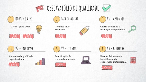 O Observatório de Qualidade (OQ) assenta na realização de um questionário acerca da implementação do Plano de Monitorização e Avaliação(PMA) do Agrupamento. O PMA é elaborado pelo Grupo de Autoavaliação do Agrupamento (GAVA) em articulação com a Direção e diversas Equipas Operacionais