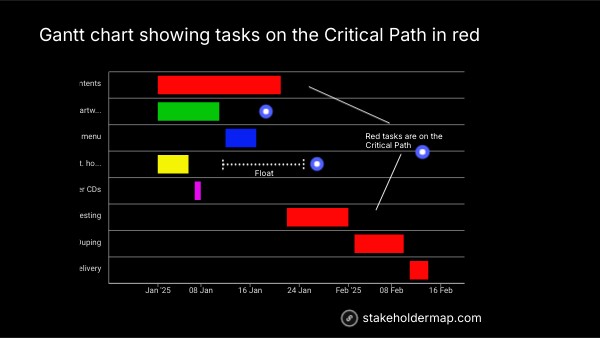 Gantt chart showing tasks on the Critical Path in red