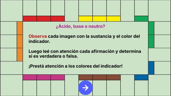 ¿Ácido, base o neutro? Observa cada imagen con la sustancia y el color del indicador. Luego leé con atención cada afirmación y determina si es verdadera o falsa. ¡Prestá atención a los colores del indicador!