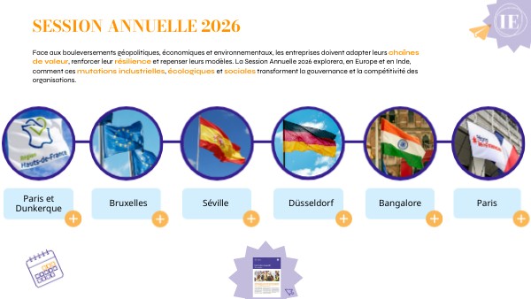 Face aux bouleversements géopolitiques, économiques et environnementaux, les entreprises doivent adapter leurs chaînes de valeur, renforcer leur résilience et repenser leurs modèles. La Session Annuelle 2026 explorera, en Europe et en Inde, comment ces mutations industrielles, écologiques et sociales transforment la gouvernance et la compétitivité des organisations.
